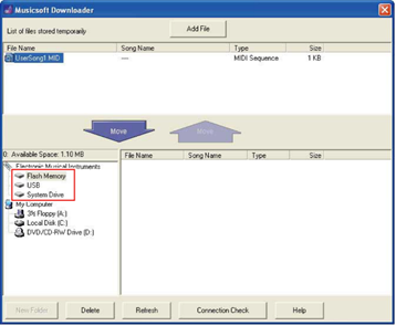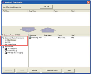 • Para transferir os dados de música (***.MID) ou de estilo (***.STY) para a memória interna do instrumento, selecione "Flash Memory" (Memória flash).