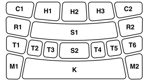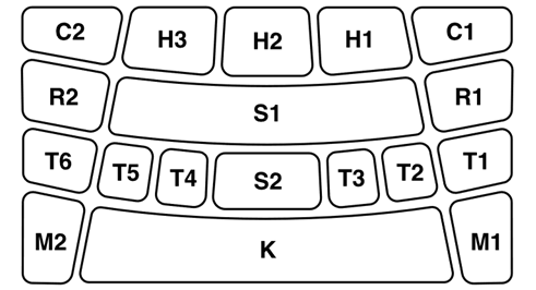 Menu 59 Utility Pad Layout“ auf „Right“ (rechts; Standardeinstellung) eingestellt ist, sind die Pad-Nummern wie nachstehend abgebildet zugewiesen. Bei dieser Einstellung wird angenommen, dass Sie hauptsächlich mit der rechten Hand spielen.