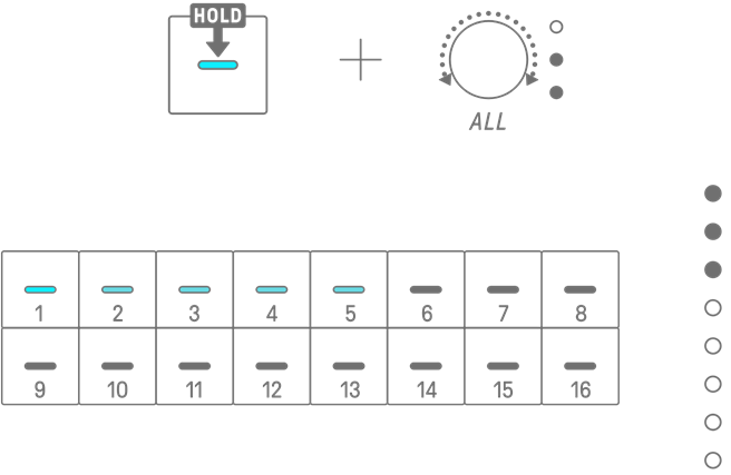 Um die Notenlänge für den ausgewählten Step zu ändern, drücken und halten Sie gleichzeitig eine leuchtende Drum-Taste und drehen Sie den [ALL]-Drehregler. Wenn der ausgewählte Step mehrere Noten besitzt, halten Sie die Drum- und Synth-Tasten gedrückt und drehen Sie dann am [ALL]-Drehregler, um die Länge einzelner Noten zu ändern.