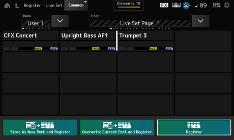 Store the Performance you have just edited before registering the Performance to the Live Set. However, when you register to the Live Set and select Store As New Perf. and Register or Overwrite Current Perf. and Register, you do not need to store the Performance in advance.