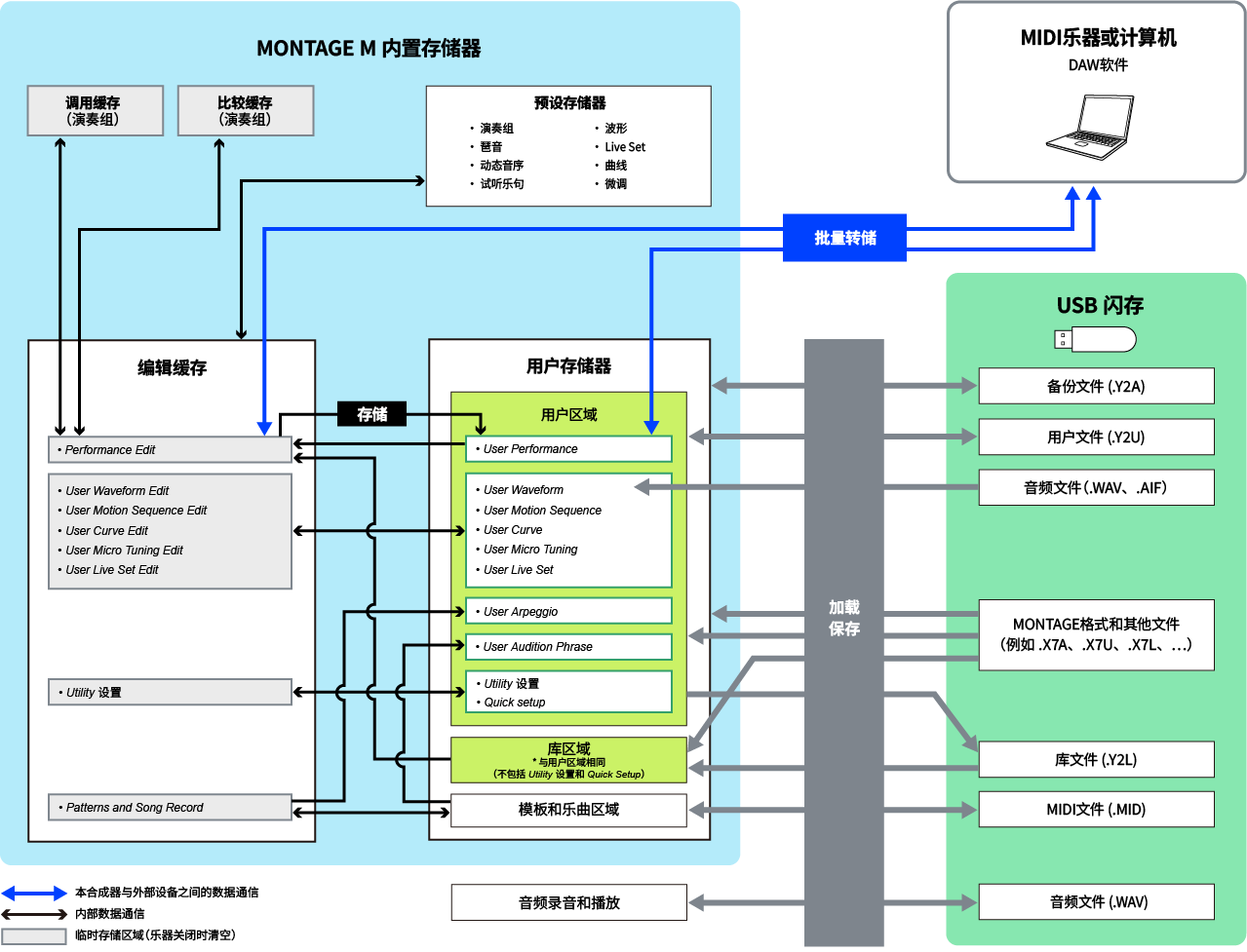 本乐器的内置存储器存储已保存的演奏组、Live Set、乐曲和其他设置。