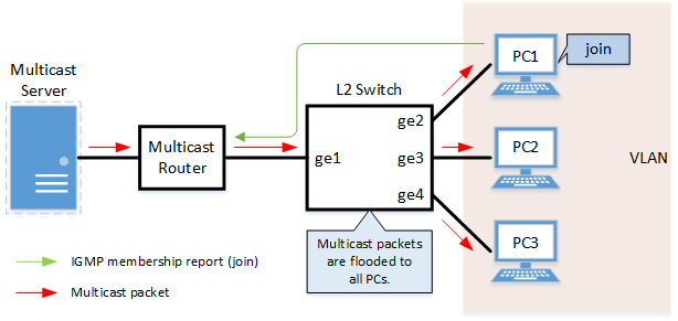 In this situation, the switch floods all ports except for the reception port with the broadcast or multicast.
