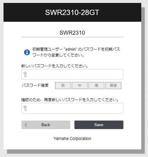 初期状態では、ユーザー名、パスワードは設定されてないため、ユーザー名入力待ち時およびパスワード入力待ち時に"Enter"キー の押下でログインが可能です。Username: admin Password: admin SWR2310-28GT Rev.2.04.01 (Thu Sep 26 17:35:20 2019) Copyright (c) 2018-2019 Yamaha Corporation. All Rights Reserved. Please change the default password for admin. New Password: ... (新しいパスワードを入力する) New Password(Confirm): ... (同じパスワードを再度入力する) Saving ... Succeeded to write configuration SWR2310>