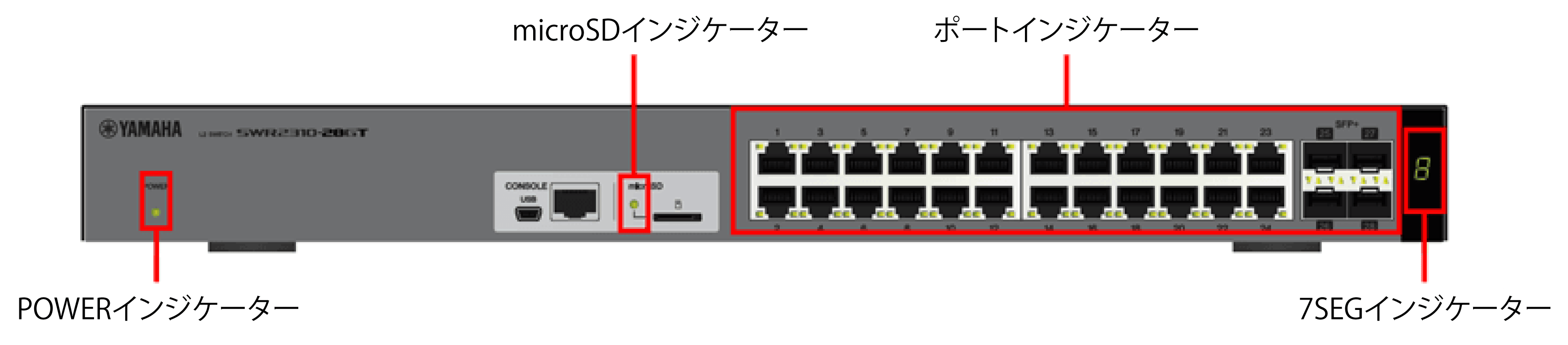 - SFP+ ポートには別売のSFP-SWRT-SR, SFP-SWRT-LR, SFP-SWRG-SX, SFP-SWRG-LX, DAC-SWRT-1M, DAC-SWRT-3M以外のSFPモジュールやDACを装着しないでください。上記以外のSFPモジュールやDACを装着した場合は動作の保証はできません。
