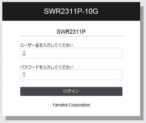 初期状態では、ユーザー名、パスワードは設定されてないため、ユーザー名入力待ち時およびパスワード入力待ち時に"Enter"キー の押下でログインが可能です。Username: ("Enter"キーを入力する) Password: ("Enter"キーを入力する) SWR2311P-10G Rev.2.02.06 (Tue Mar 13 08:41:39 2018) Copyright (c) 2018 Yamaha Corporation. All Rights Reserved. SWR2311P> - 以降、本製品の利用環境にあわせた設定を行います。