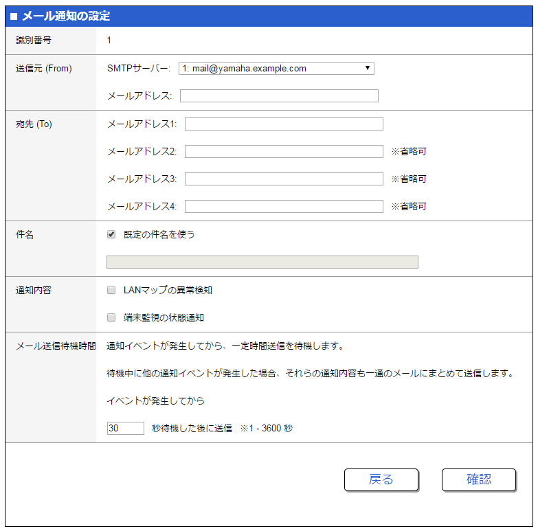 工場出荷時の状態ではユーザー名とパスワードは設定されていないため、ユーザー名とパスワードの入力は不要です。 - 以降、本製品の利用環境にあわせた設定を行います。