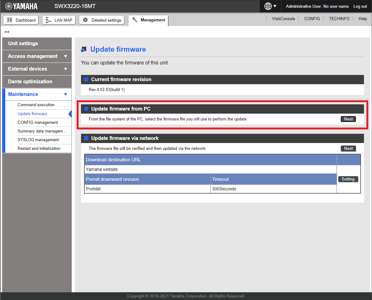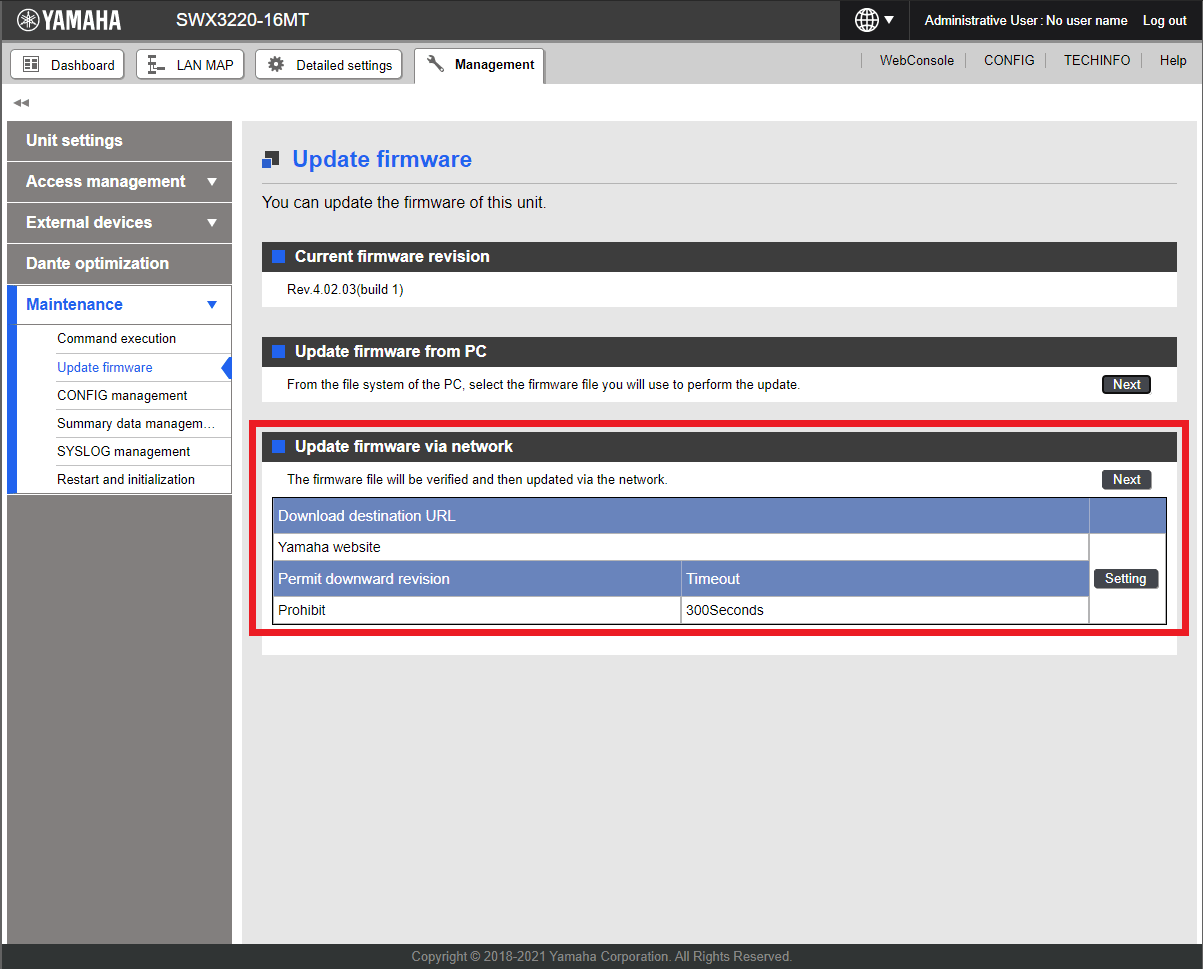 Enter the username and password to enable login.Username: yamaha (If "yamaha" was specified) Password: 1a2b3c4d (If "1a2b3c4d" was specified) SWX3220-16MT Rev.4.02.XX (Fri Jan 1 00:00:00 2021) Copyright (c) 2018-2020 Yamaha Corporation. All Rights Reserved. Yamaha>