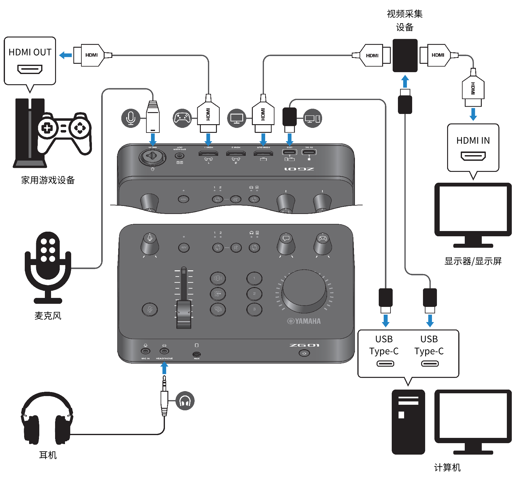 - 使用 HDMI 线缆将 ZG01 的 [HDMI OUT] 插孔与视频采集设备的 HDMI 输出相连接。