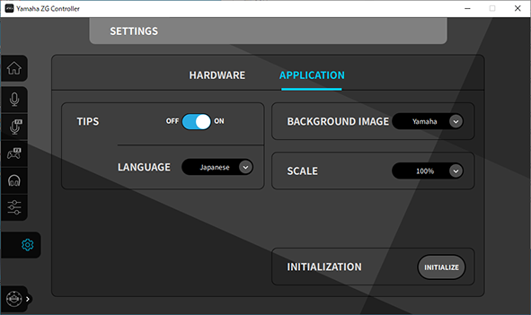 「SETTINGS (APPLICATION)」画面の「LANGUAGE」で操作ガイドやTIPS(ボタンなどのガイド)の表示言語を切り替えできます。初回起動時は、OSの言語設定に従って、英語、日本語、中国語のいずれかに切り替わります。