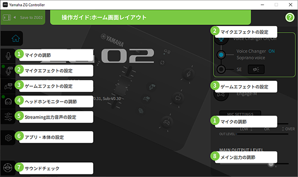「Yamaha ZG Controller」は、ZG02 の設定やコントロールを行うためのアプリケーションソフトウェア です。ZG02 のマイク音声やモニター音声の調節、ボイスエフェクトやゲームエフェクトの設定、ファームウェアのバージョンアップなどができます。