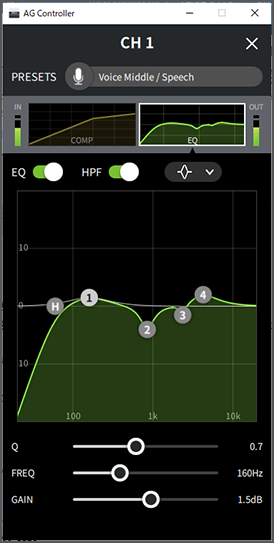 如需详细设置本产品,请使用 AG Controller 应用程序。以 EQ 和混响设置为例,以下为二者的设置页面。