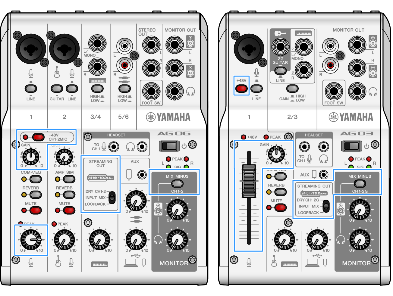 - 用推子(仅限 AG03MK2)或音量旋钮来调节各自的音量。
