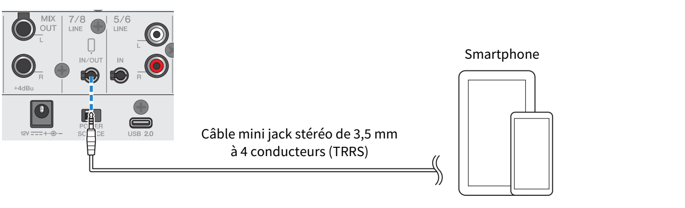 Pour diffuser en continu une conversation que vous avez sur votre smartphone via l’ordinateur (quand des invités participent via des appels téléphoniques), reliez la prise d’entrée/de sortie de smartphone [LINE 7/8 IN/OUT] à la prise casque de votre smartphone (iPhone, dispositif Android, etc.) avec un câble mini jack stéréo (TRRS) de 3,5 mm à 4 conducteurs.