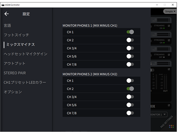 g | [MIX MINUS CH1/ MIX MINUS CH2] スイッチ オン(O)にすると、チャンネル1、チャンネル2に入力された音が、[PHONES 1(H)/PHONES 2(H)] 端子から出力されなくなります(モニタリングOFF)。モニター時に自分の音声を入れたくないときに使用します。 たとえば、配信や録音を行う際に、ヘッドホンから「自分の声」や「自分の演奏」を聞く必要がない時に、[MIX MINUS]スイッチをオンにします。 |