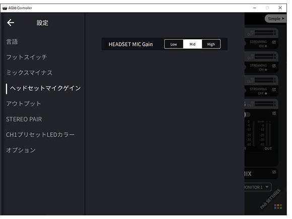 ]ボタンを押し、設定→ヘッドセットマイクゲインを選択し設定してください。