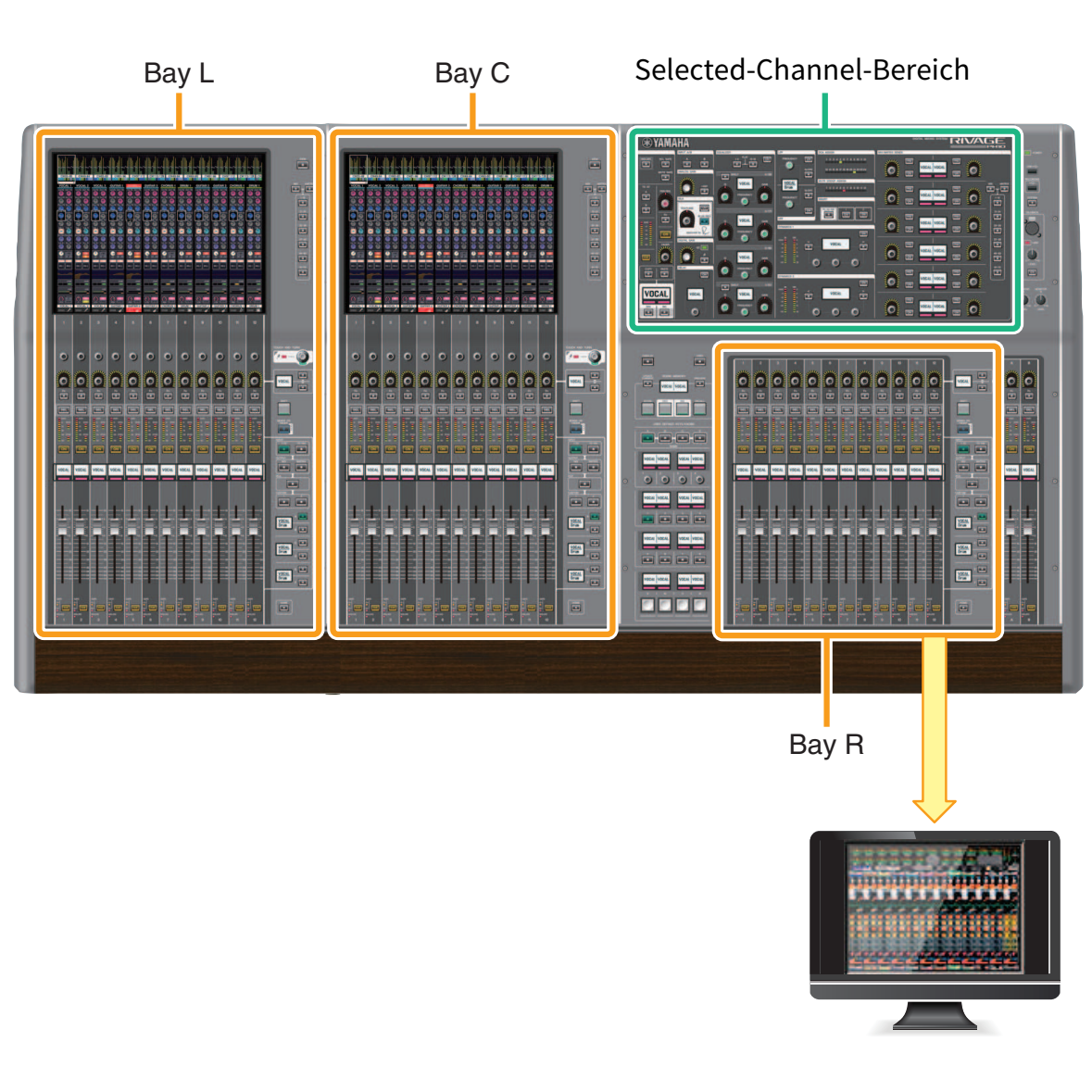 Eine „Bay“ besteht aus einer Gruppe von 12 Fadern im Touchscreen-Bereich und im Kanalzugbereich. Die Modelle CS-R10 und CSD-R7 besitzen drei Bays; das CS-R10-S besitzt zwei Bays. Sie können diese Bays unabhängig voneinander bedienen. Daher können Sie Mischvorgänge ausführen, z. B. Abruf von Einstellungen auf dem Touchscreen oder Umschalten zwischen Ebenen mit jeweils 12 Fader einer Bay, ohne die Einstellungen anderer Bays zu beeinflussen. Beachten Sie bitte, dass die Bay R (im Gegensatz zu Bay L und C) nicht über einen Touchscreen oder die darunter befindlichen Regler verfügt. Wenn Sie einen externen Monitor anschließen, können Sie diesen ausschließlich für Bay R verwenden. Der externe Monitor zeigt Display-Inhalte ähnlich wie Bay L und Bay C an, er zeigt jedoch Layer oder Kanäle an, die bei Bay R ausgewählt wurden.
