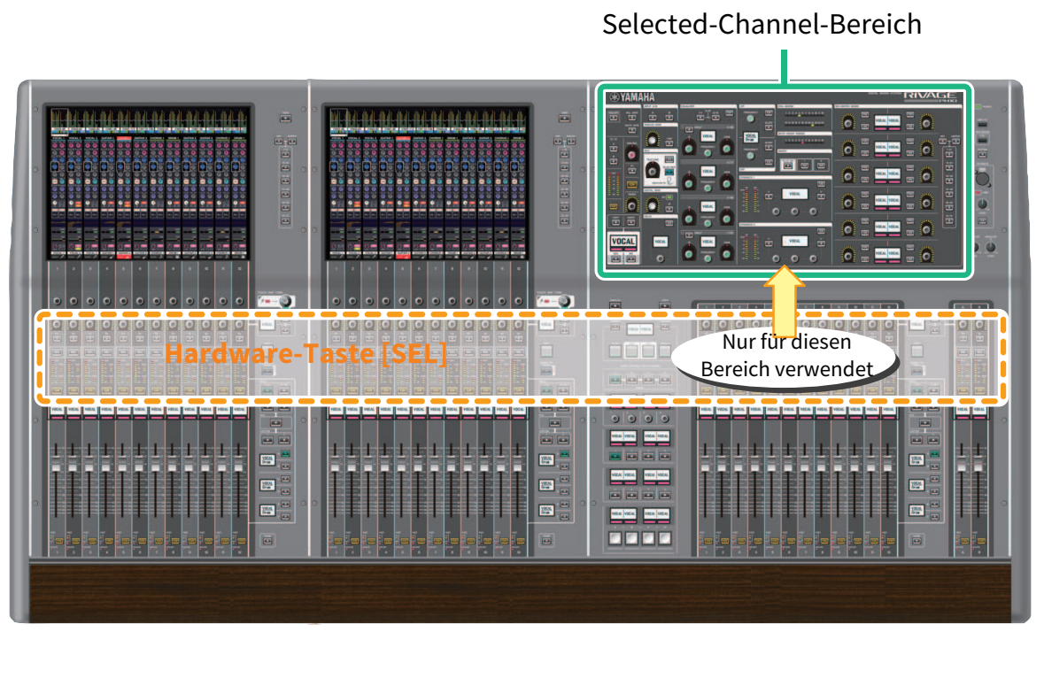 Mit einer [SEL]-Taste können Sie den entsprechenden Kanal für den Selected-Channel-Bereich (Hardware) auswählen. Die [SEL]-Tasten können jedoch auch mit auf dem Bildschirm ausgewählten Kanälen verknüpft werden, um Kanäle einer DCA- oder einer Mute-Gruppe zuzuordnen.