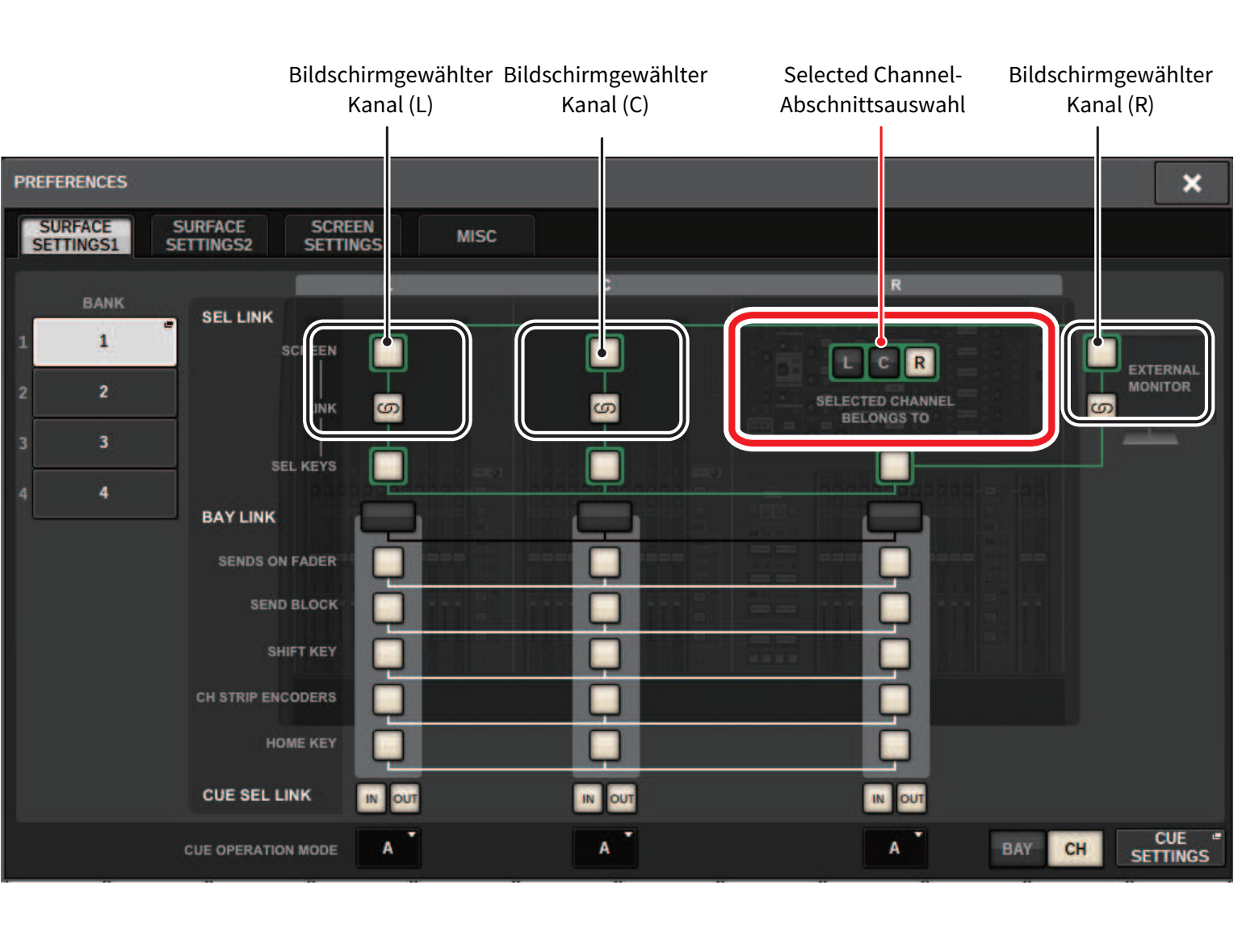 Im PREFERENCES-Fenster können Sie eine Verknüpfung zwischen den auf dem Bildschirm ausgewählten Kanälen/Parametern und den [SEL]-Tasten (Hardware) einrichten, und Sie können eine Verbindung zwischen den [SEL]-Tasten der einzelnen Bays einrichten.
