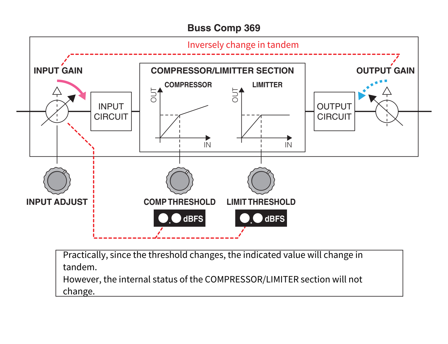 Practically, since the threshold changes, the indicated value will change in tandem. However, the internal status of the , COMPRESSOR/LIMITER section will not change. |
