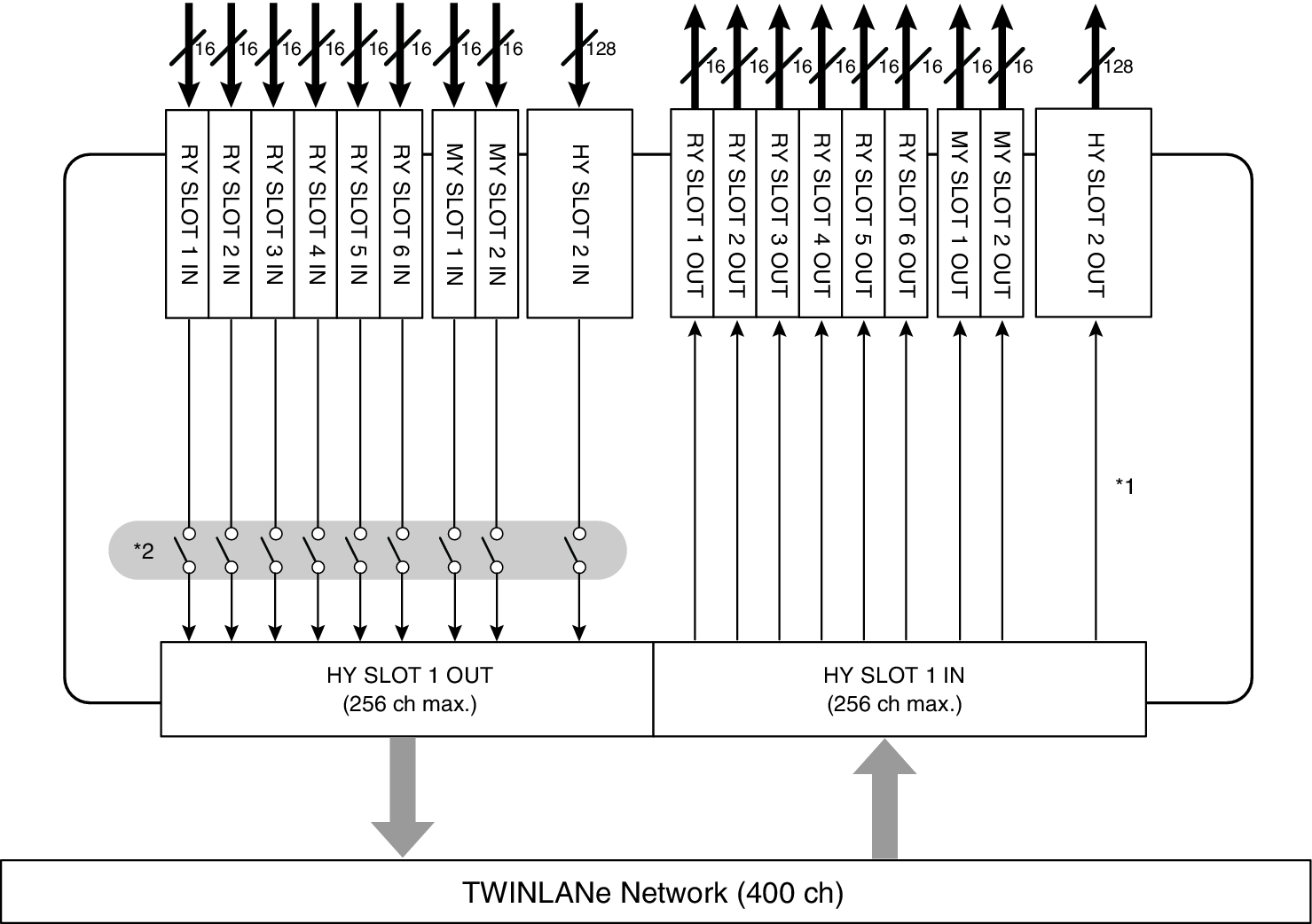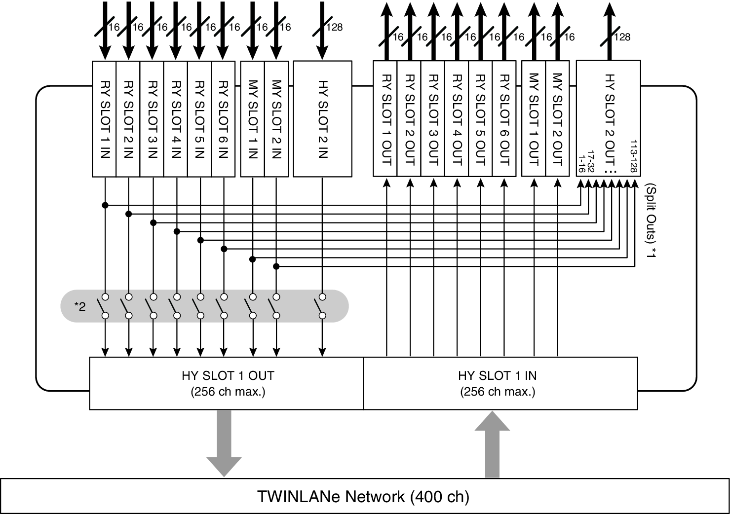 *1) In mode 1, all input signals (total 128 channels) of the RY slots and MY slots are always split for output to the HY SLOT 2 output. The signal is output immediately after gain compensation.