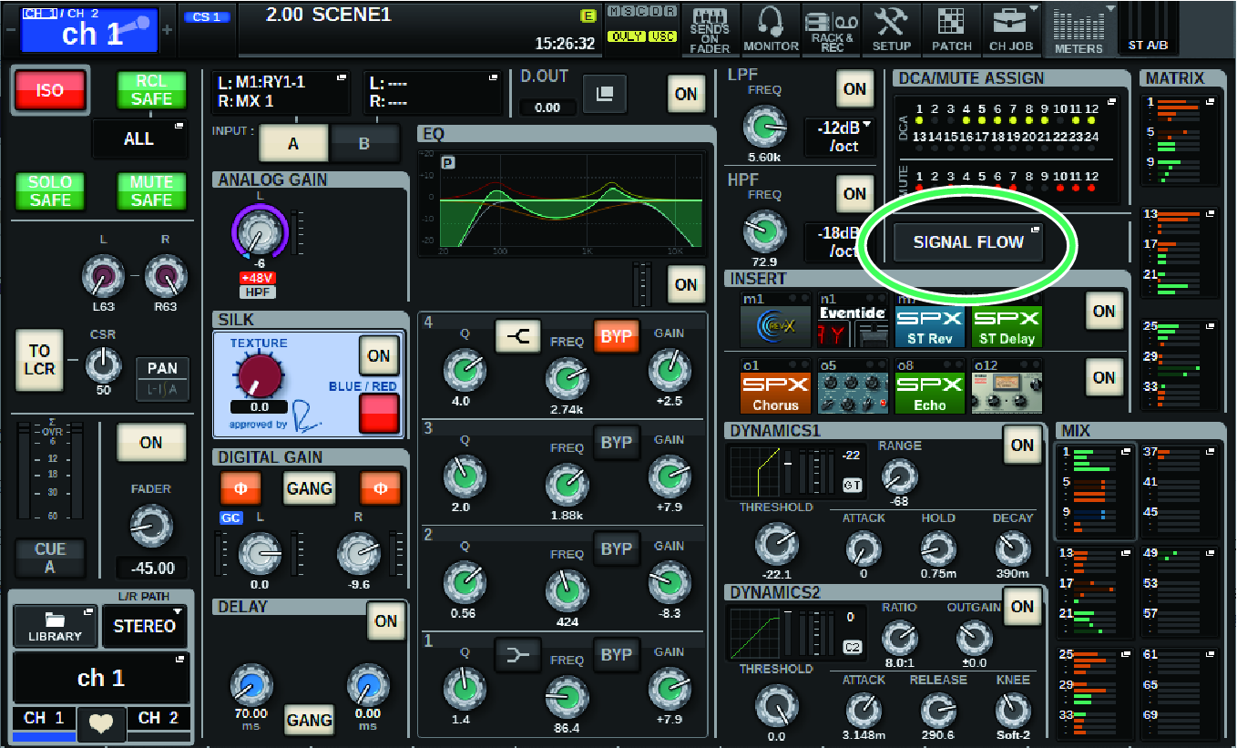 A signal flow window enables you to view the entire signal flow of a single channel. You can also specify the insert points, delay point, and direct out point in this window. In addition, you can view the location within the signal flow at which clipping may have occurred.