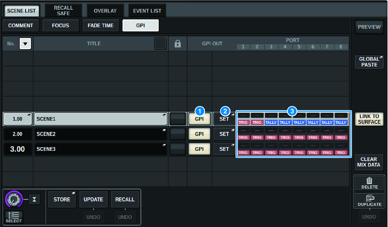 c | GPI PARAMETER display section In this section, indicators show the status of the GPI settings specified for each scene. |