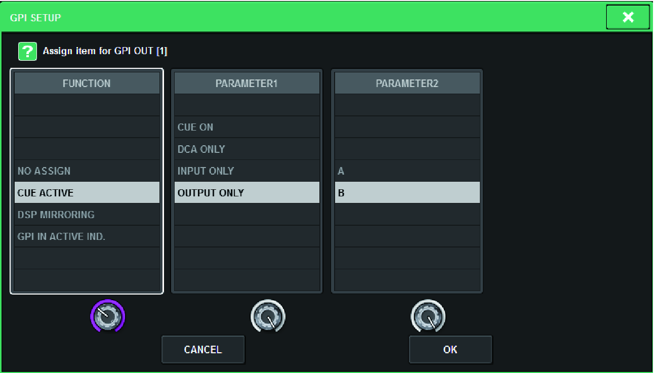 - To assign the function or parameter that you want to control, press the GPI OUT SETUP popup button.