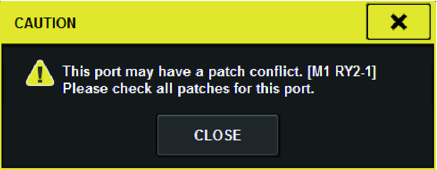 - When there is a patching conflict, PORT IDENTIFY on the I/O rack will be disabled. Also, the message shown below will be shown at the bottom of the screen in yellow.