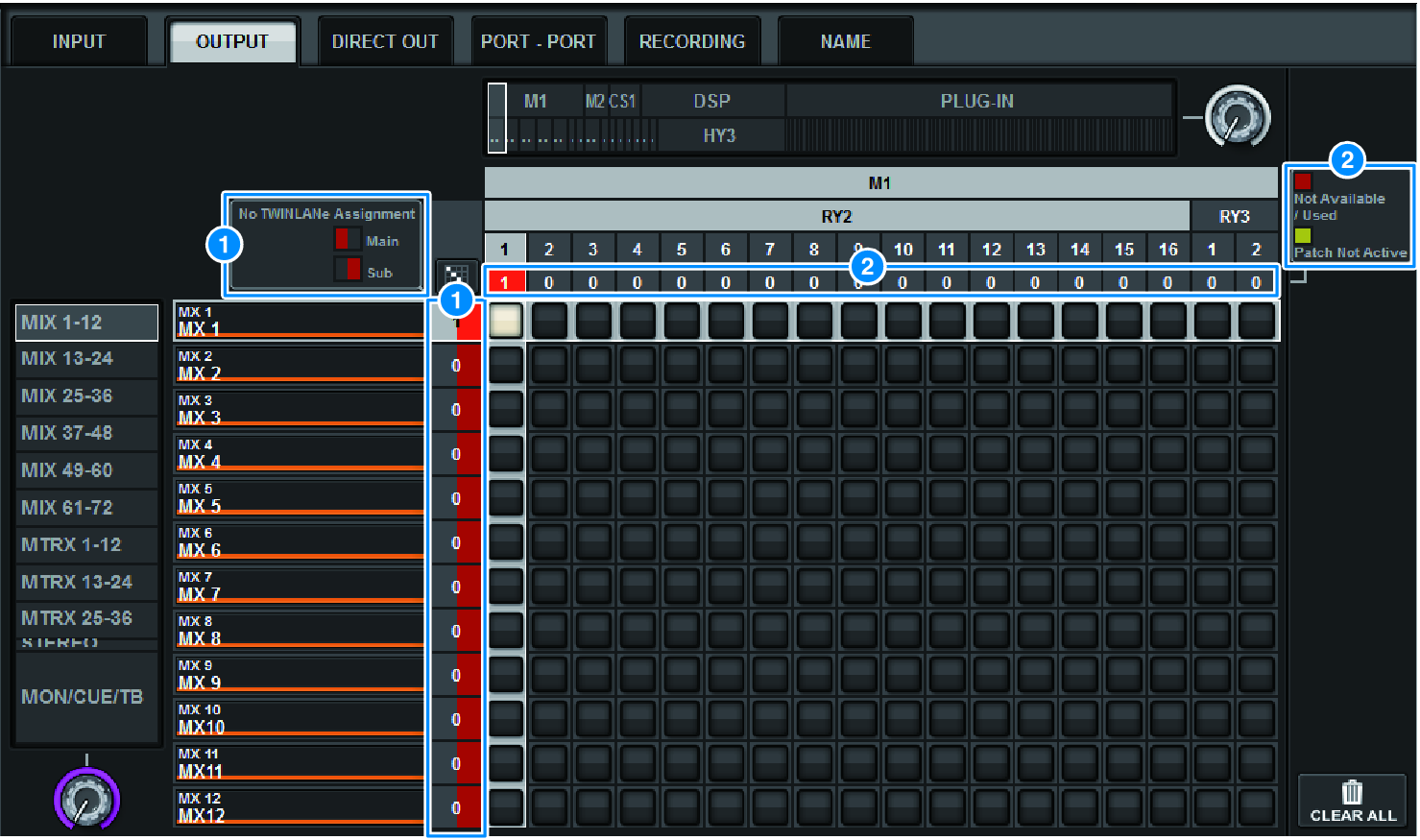 a | TWINLANe network (Main, Sub) assignment display Output channels that are not assigned to the TWINLANe network are shown with the number of patches in red. (left half is Main, right half is Sub) |