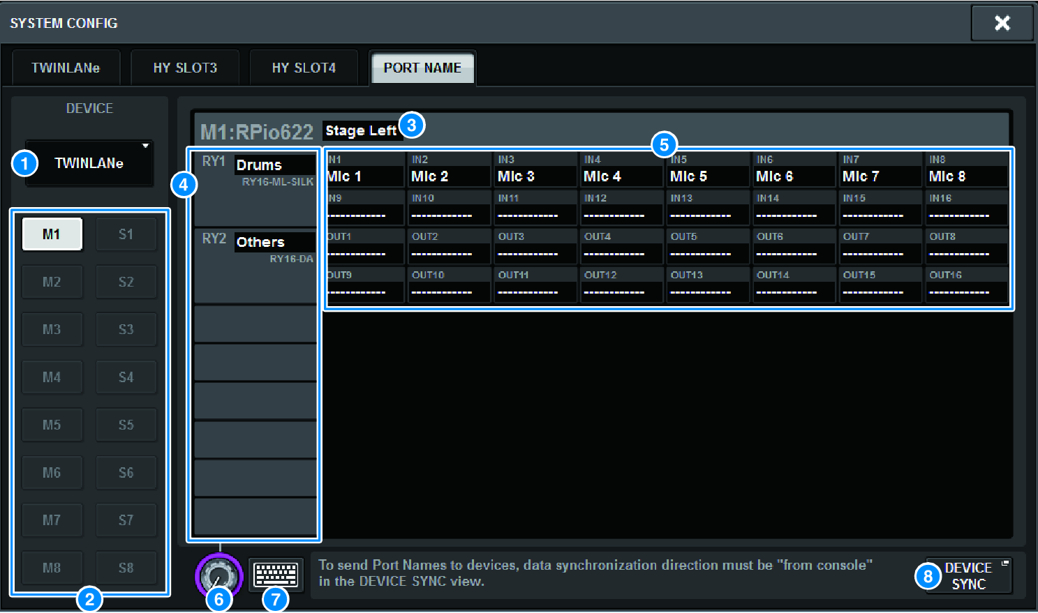 h | DEVICE SYNC/DANTE SETUP popup button Press this button to access the DEVICE SYNC popup window, where you can sync the port names and so on. |