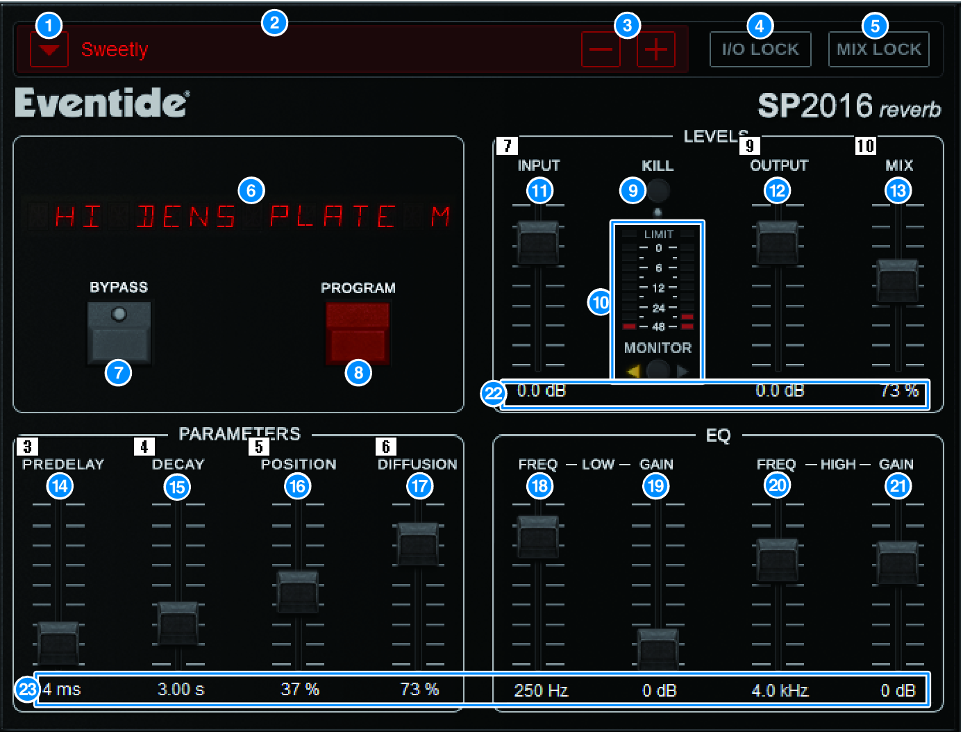 The SP2016 Reverb is an authentic recreation of the original rack processor from the Eighties. Highly regarded for its signature reverbs, the SP2016 was used in countless hit records for nearly 40 years. The SP2016 Reverb plug-in includes vintage and modern versions of Room, Stereo Room and Hi-Density Plate. The plug-in naturally captures every aspect of the sound of a real physical environment - from the complex early reflections, to the natural way in which the echo density increases with time, to the smooth Gaussian decay of the reverb tail. The structure of the reverb can be modified by fine-tuning the controls - including PreDelay, Decay, Position and Diffusion. The EQ section allows for simple high and low filtering of the reverb with adjustable filter ranges. The unique Position control takes the listener from the stage to back of the room increasing the early reflections while retaining all other settings.