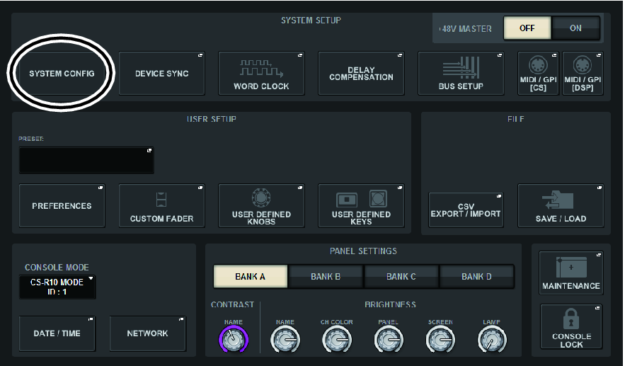 - Press the SYSTEM CONFIG button in the SETUP screen.