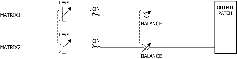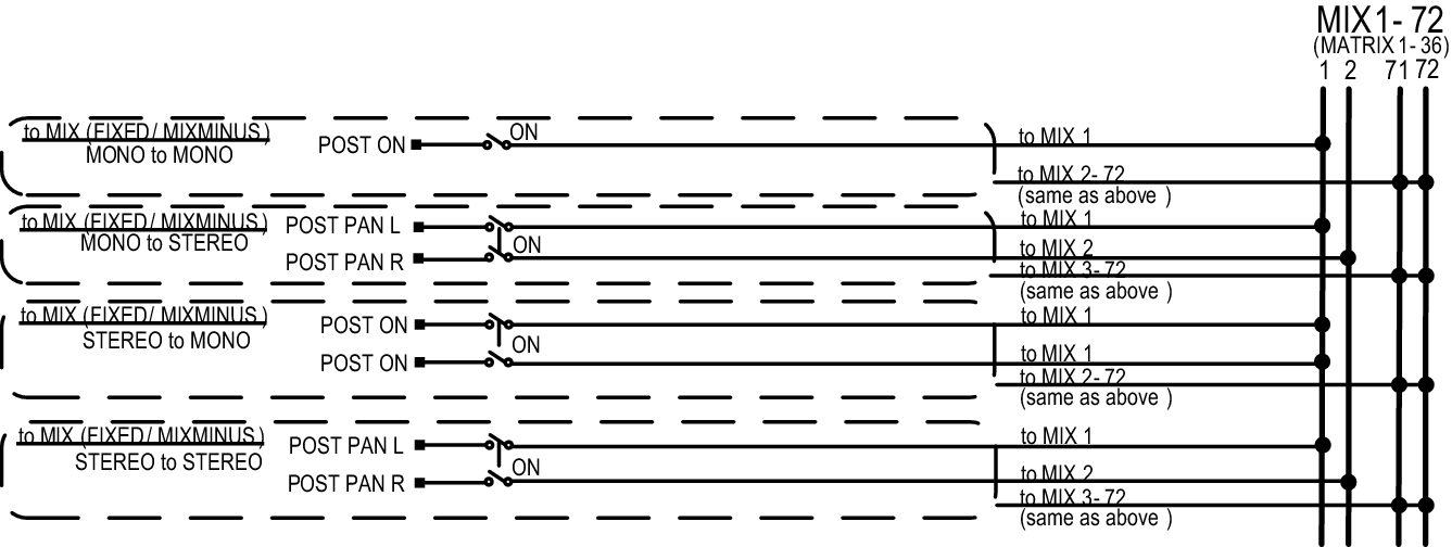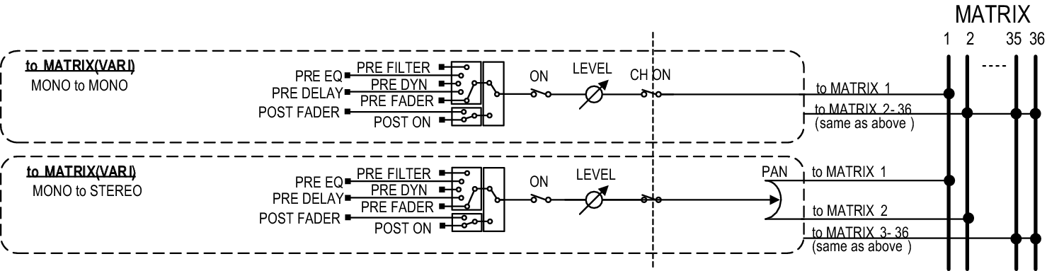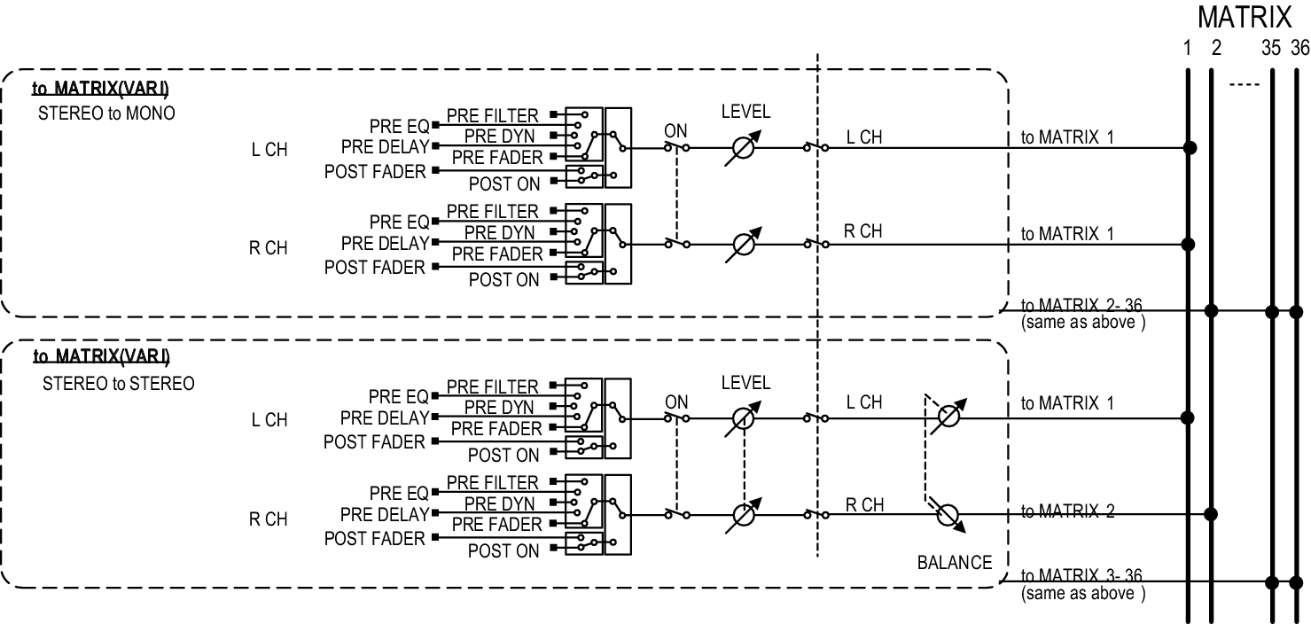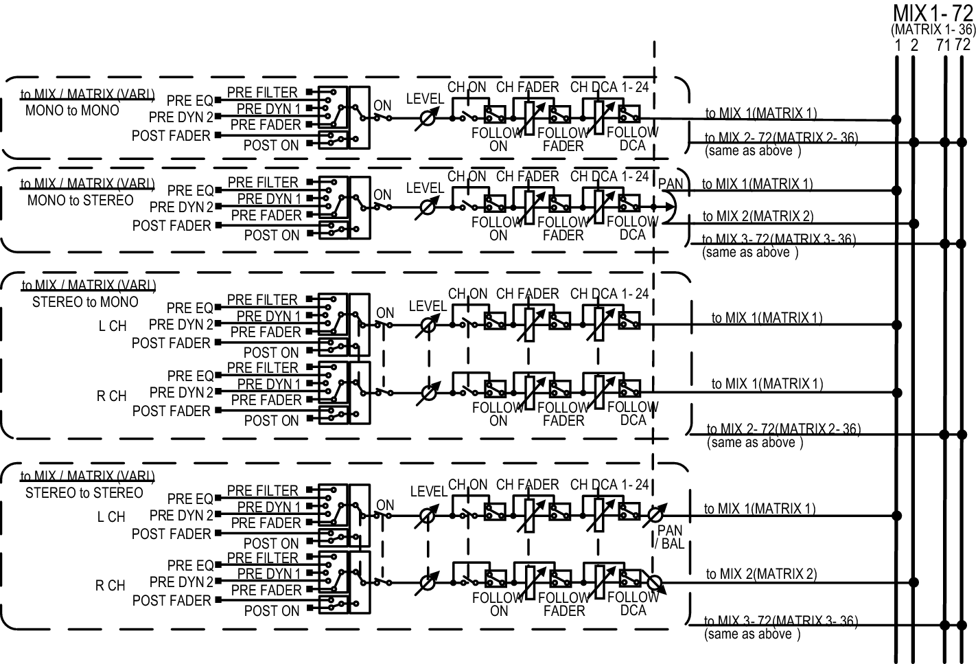 You can pair either odd/even-numbered channels or even/odd-numbered channels. For single input channels (monaural), the pan level is nominal at the center, and +3 dB at hard left or hard right. For paired input channels, the balance level is nominal at the center, and +3 dB at hard left or hard right.