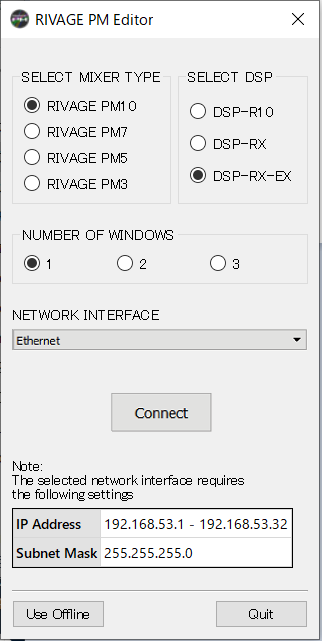 - Haga clic en el botón Connect para que la serie RIVAGE PM se enlace a PM Editor.