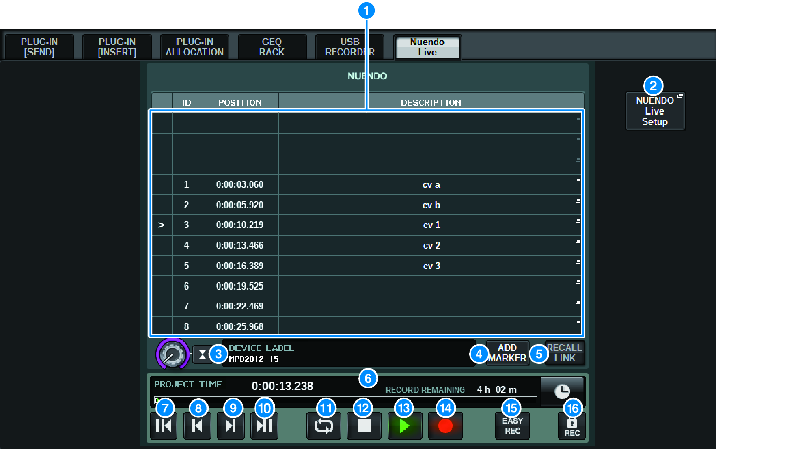 a | Campo de lista de marcadores Muestra la información de marcadores registrada en el proyecto de Nuendo Live activo. Puede desplazarse por la lista accionando el mando con el codificador de pantalla o el mando [TOUCH AND TURN]. Al pulsar este campo, se abre una ventana de teclado que permite editar la información del marcador. |