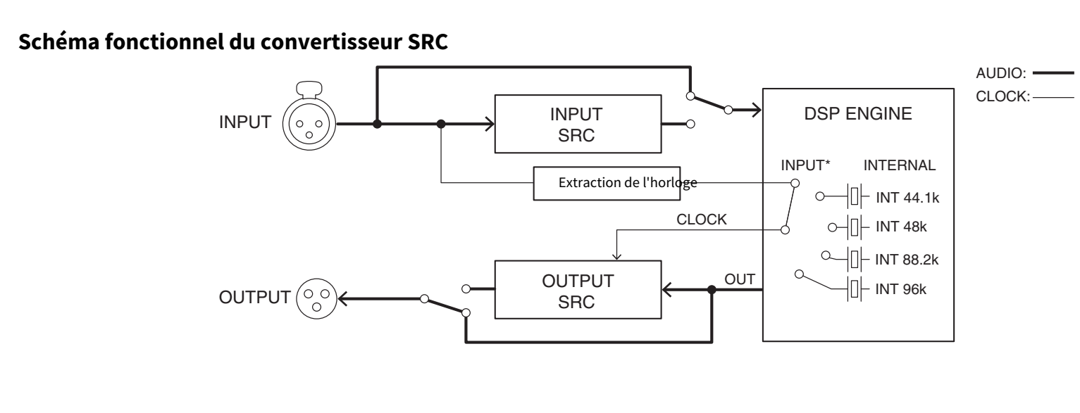 Le convertisseur SRC d'entrée convertit le signal en signal d'horloge système de la série RIVAGE PM. Le convertisseur SRC de sortie convertit le signal en fonction du signal spécifié pour l'horloge interne ou pour l'horloge entrant sur le même canal.