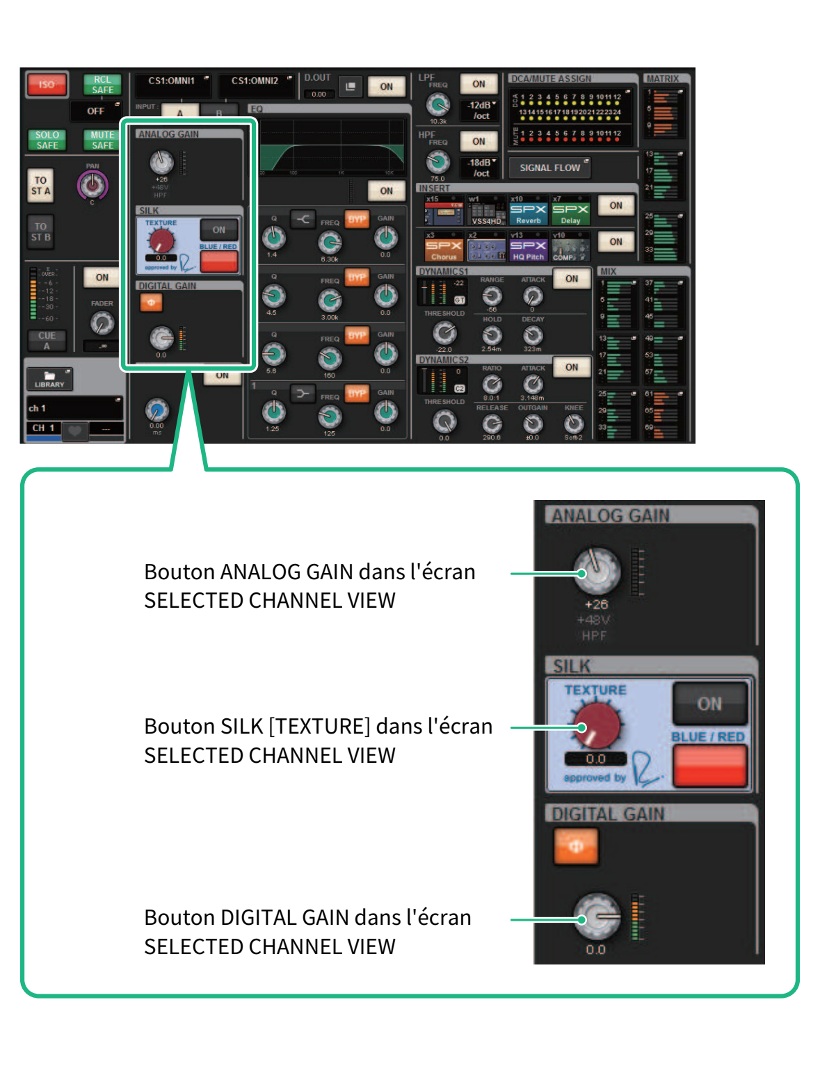 Contrôle de GAIN/SILK via l'écran SELECTED CHANNEL VIEW
