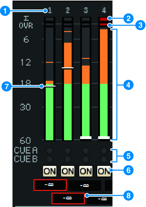 g | Fader Indica il livello del canale come posizione del fader. Quando il tasto [ON] del canale è disattivato, il fader diventa grigio. Trascinare con il mouse per regolare il livello. Utilizzare CTRL+clic del mouse per tornare al valore predefinito oppure CTRL+MAIUSC+clic del mouse per impostare il valore nominale. |