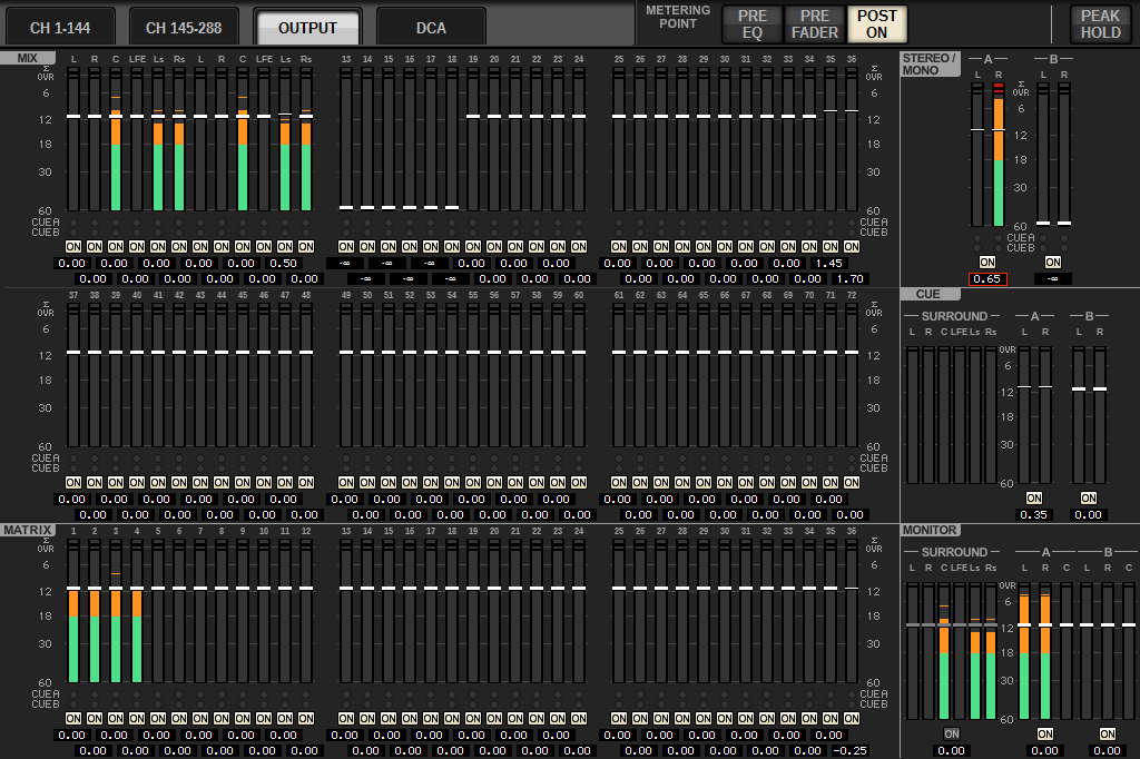 In questa schermata vengono visualizzati gli indicatori per tutti i canali di uscita, STEREO A/B, CUE A/B e MONITOR A/B.