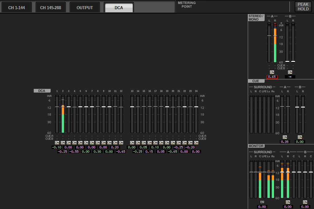 In questa schermata vengono visualizzati gli indicatori per DCA, STEREO A/B, CUE A/B e MONITOR A/B.