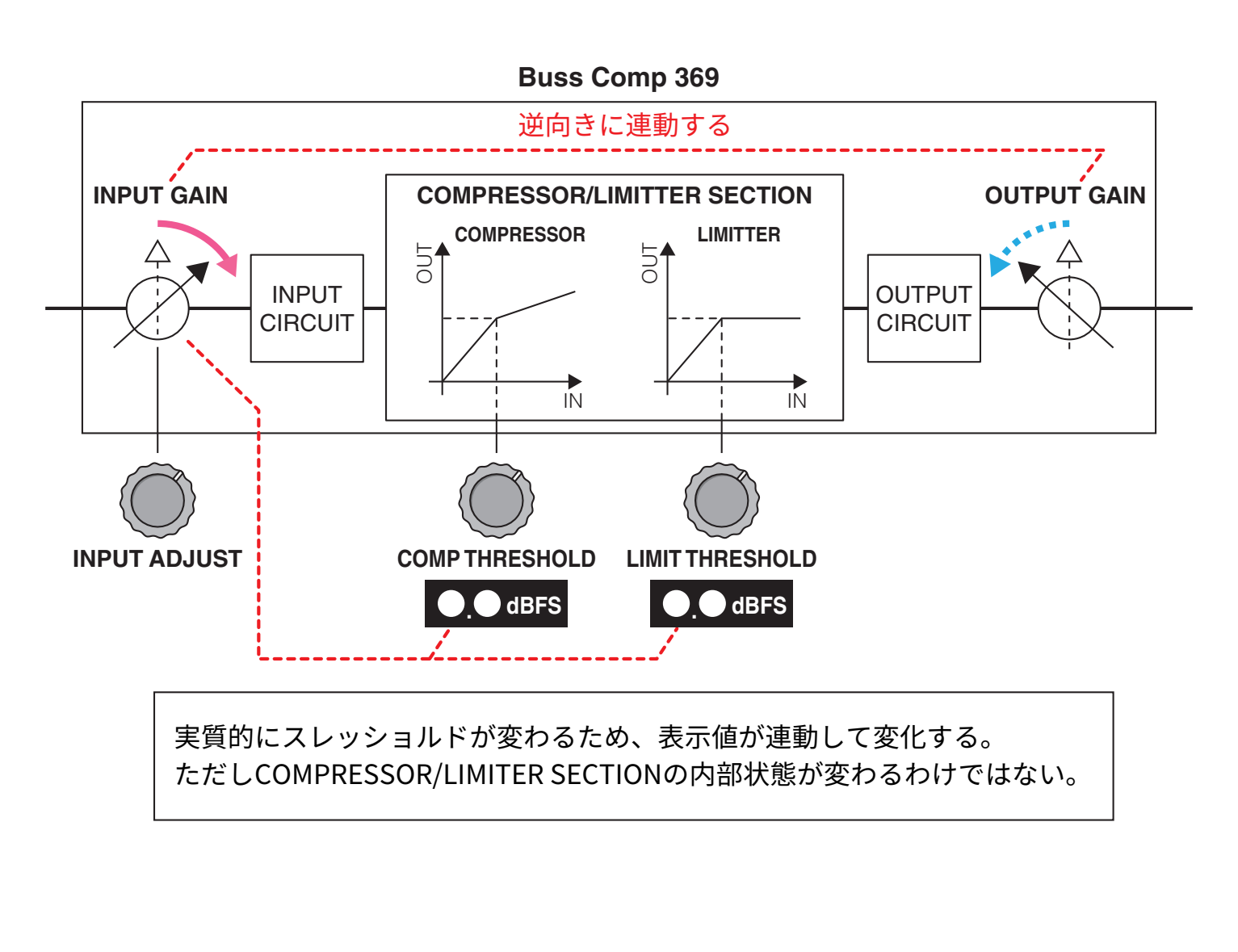 実質的にスレッショルドが変わるため、表示値が連動して変化する。ただし、COMPRESSOR/LIMITER SECTIONの内部状態が変わるわけではない。 |