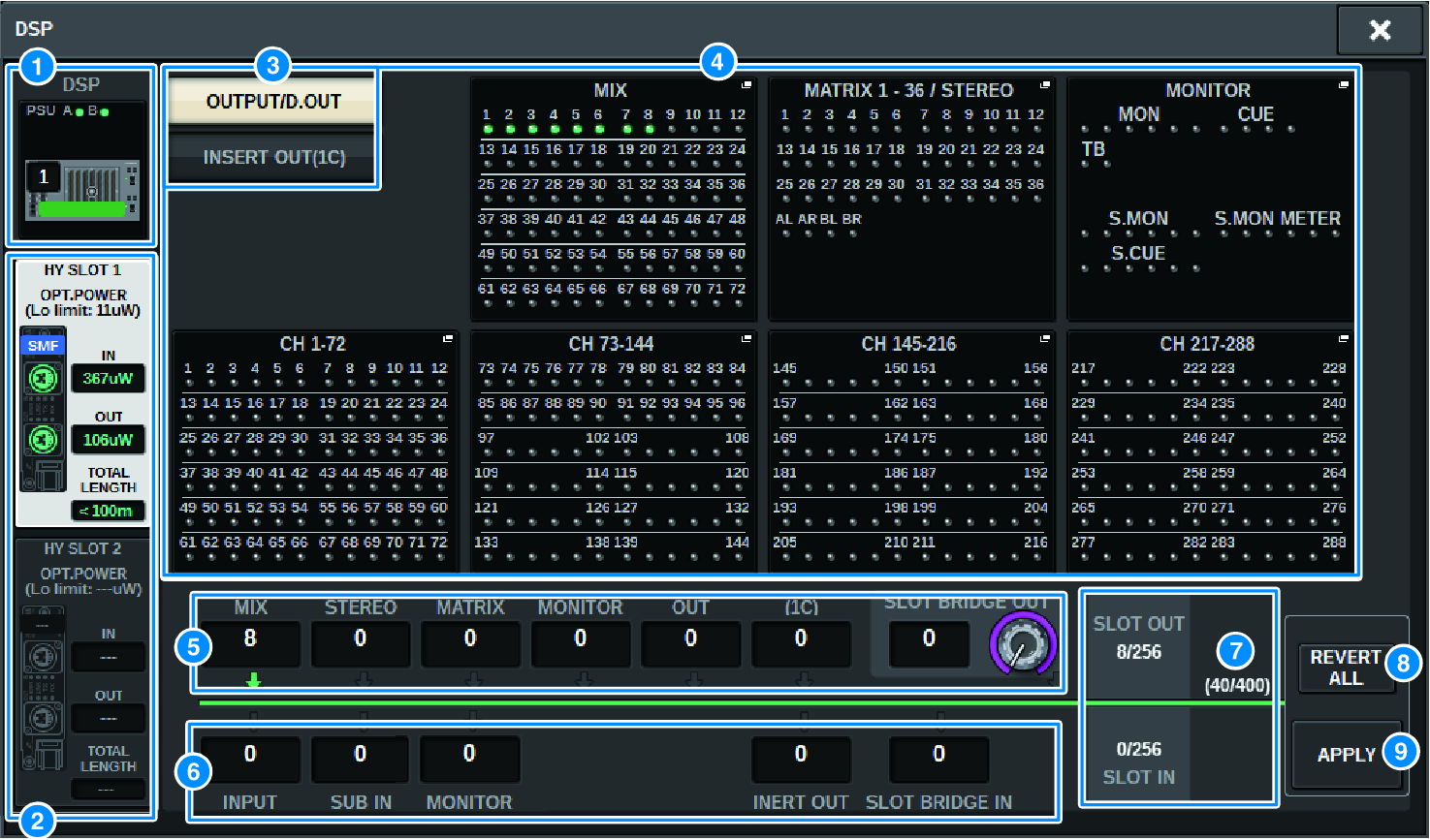 e | SLOT OUT チャンネル割り当て表示 TWINLANeネットワークカードで現在使用されている出力チャンネル数を表示します。 |