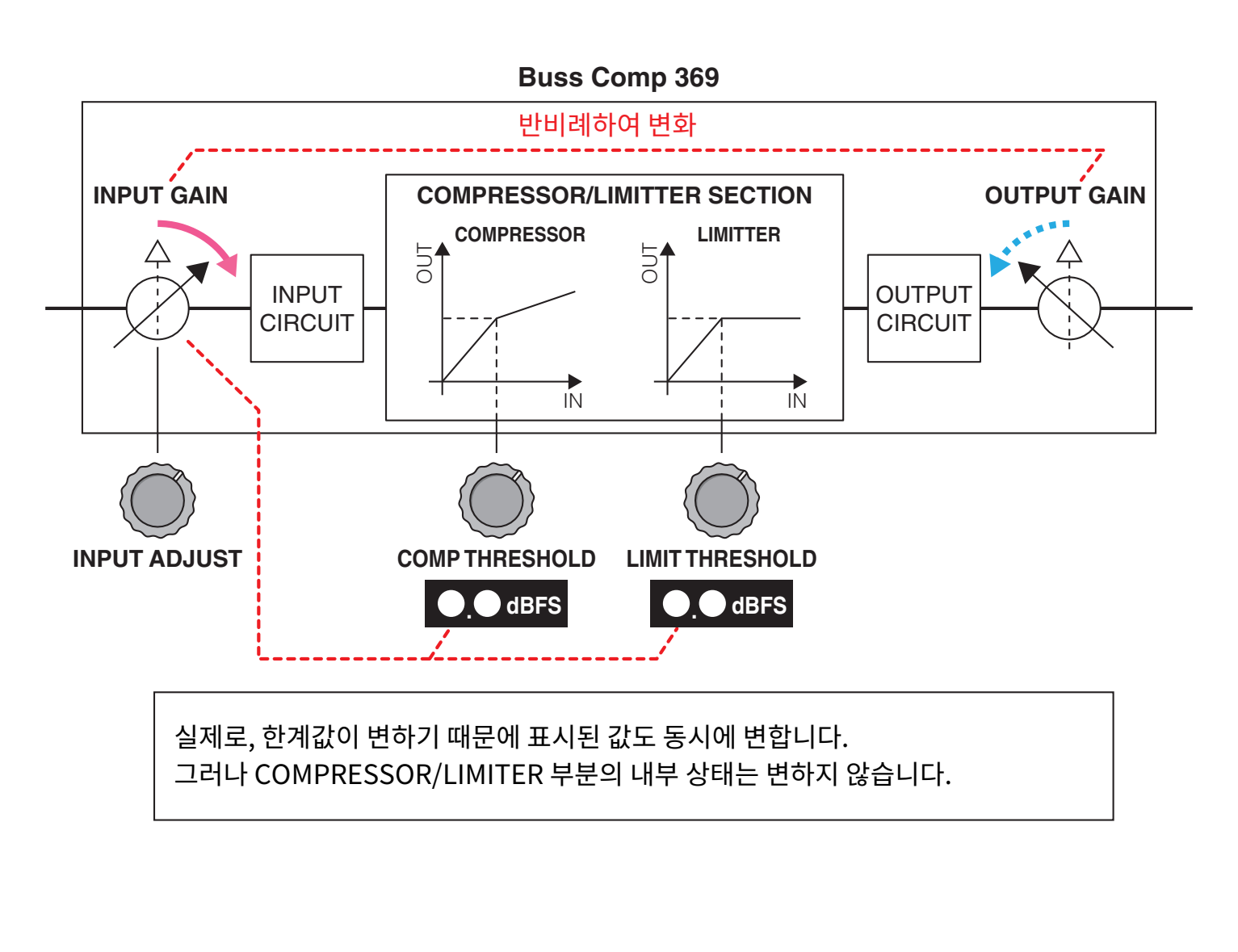 실제로, 한계값이 변하기 때문에 표시된 값도 동시에 변합니다. 그러나 COMPRESSOR/LIMITER 부분의 내부 상태는 변하지 않습니다. |
