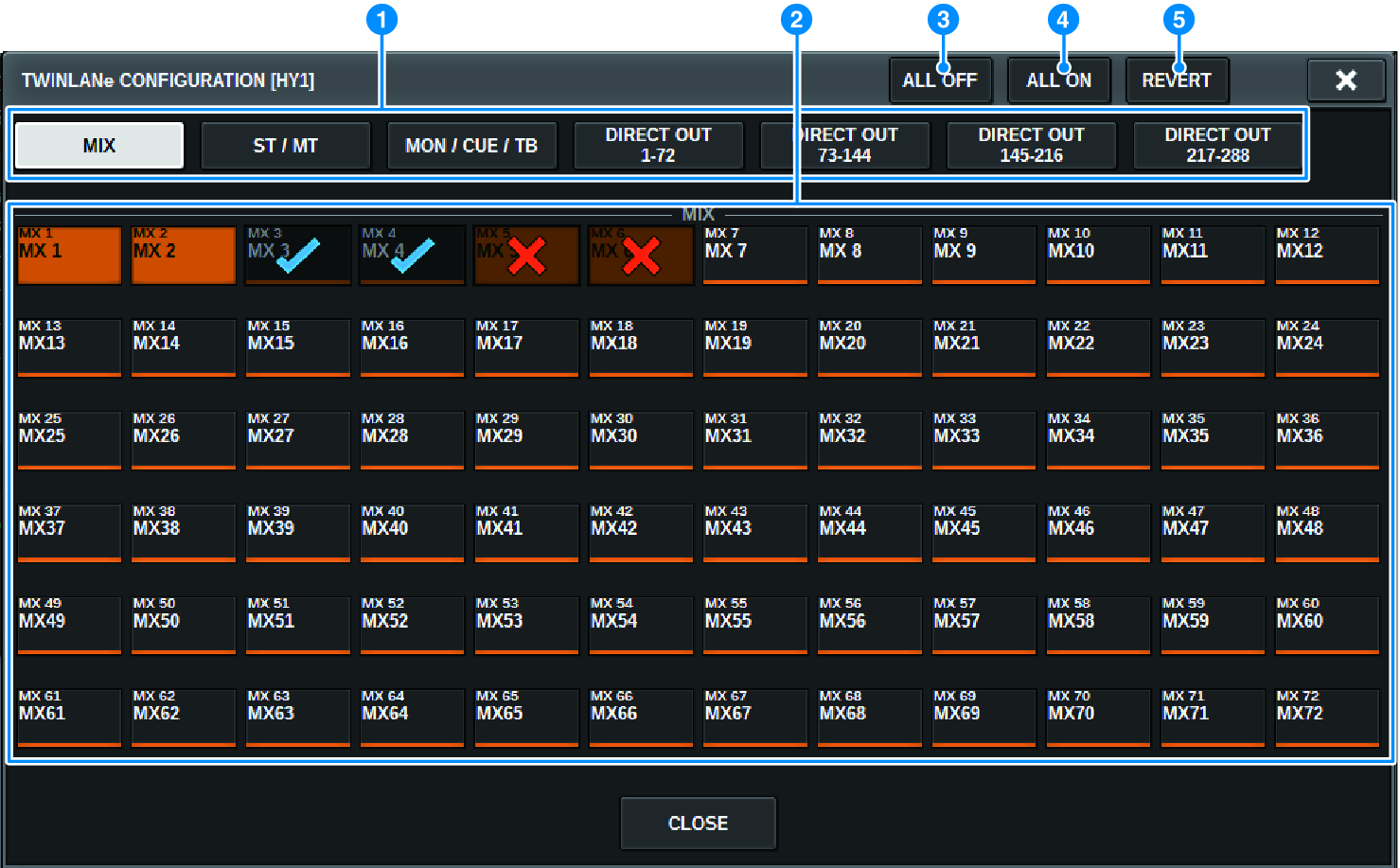 a | 탭 MIX OUT, ST/MT/MON/CUE/TB, DIRECT OUT 1–72와 DIRECT OUT 73–144를 서로 전환합니다. |