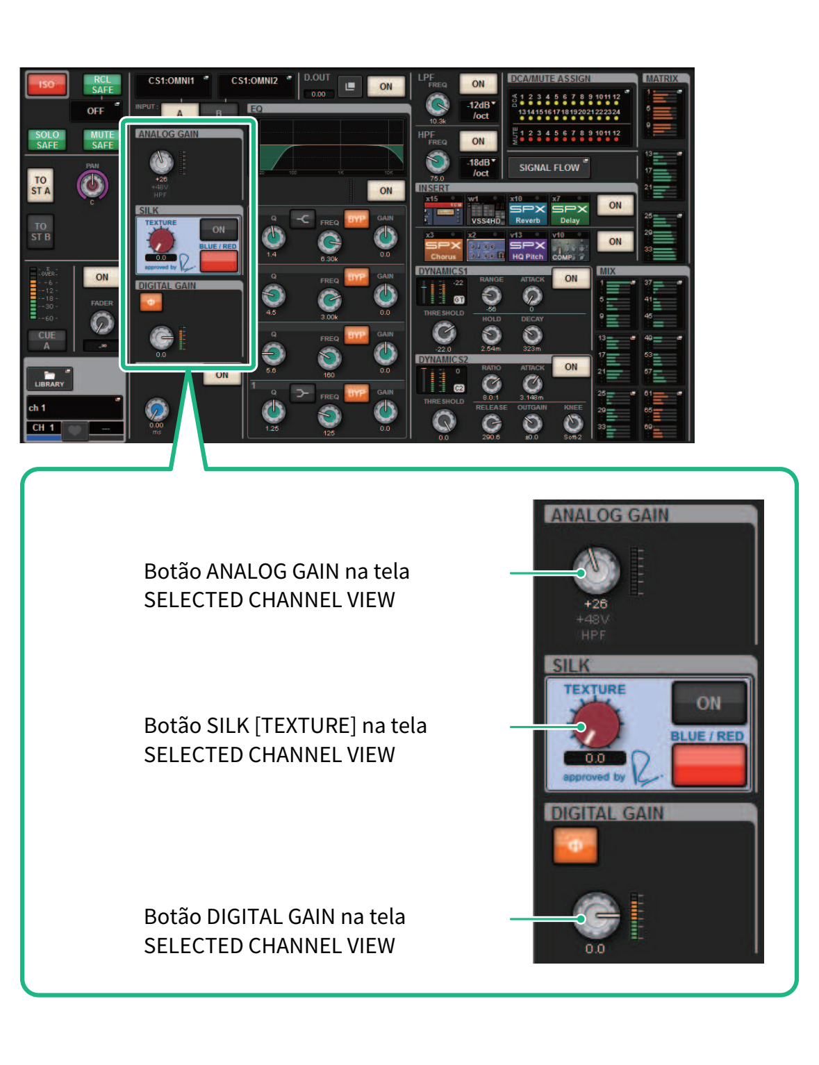 Controle de GAIN/SILK por meio da tela SELECTED CHANNEL VIEW