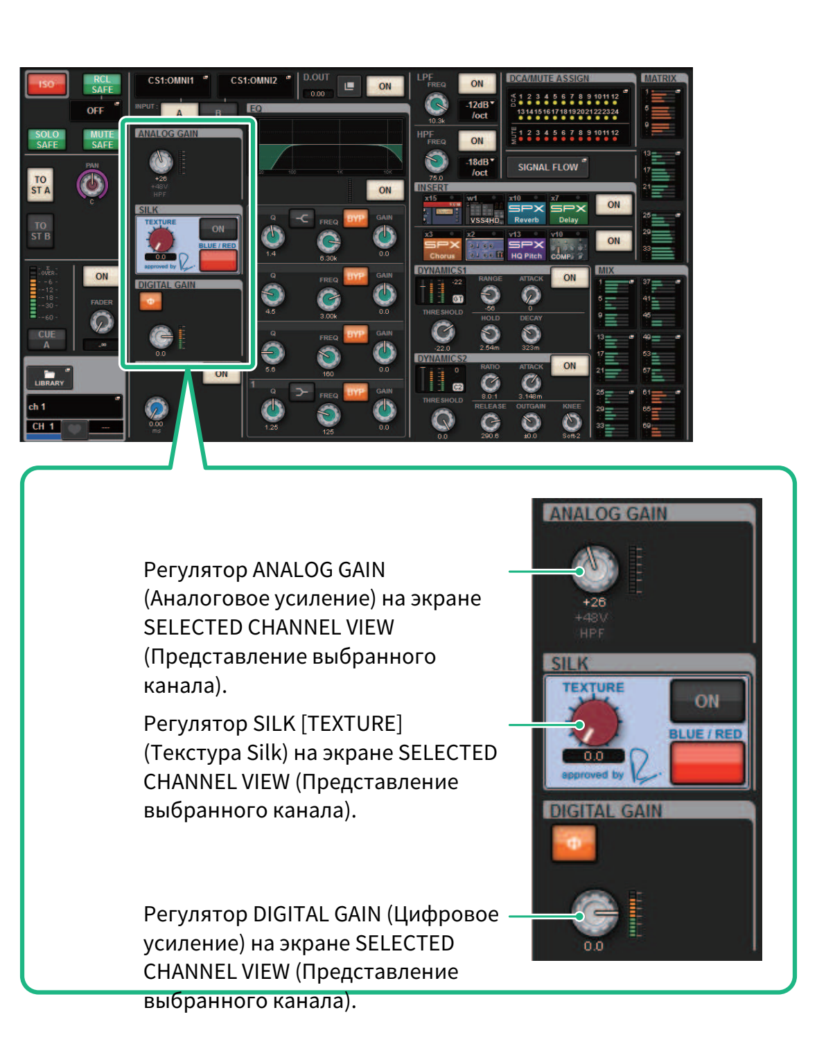 Управление GAIN/SILK на экране SELECTED CHANNEL VIEW (Представление выбранного канала)