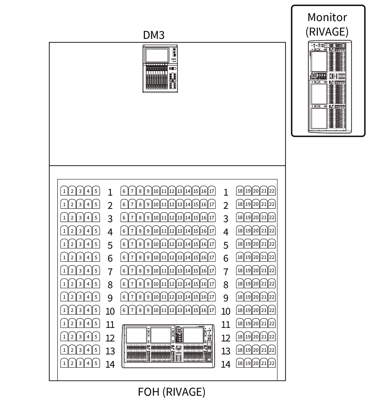 For example, say a drummer wants to adjust monitor balance herself, this allows her to exercise the functions of both a personal monitor mixer and an I/O device, reducing the equipment required. By configuring the DM3 series as a remote I/O device, you can share and remotely control the FOH console and head amp.