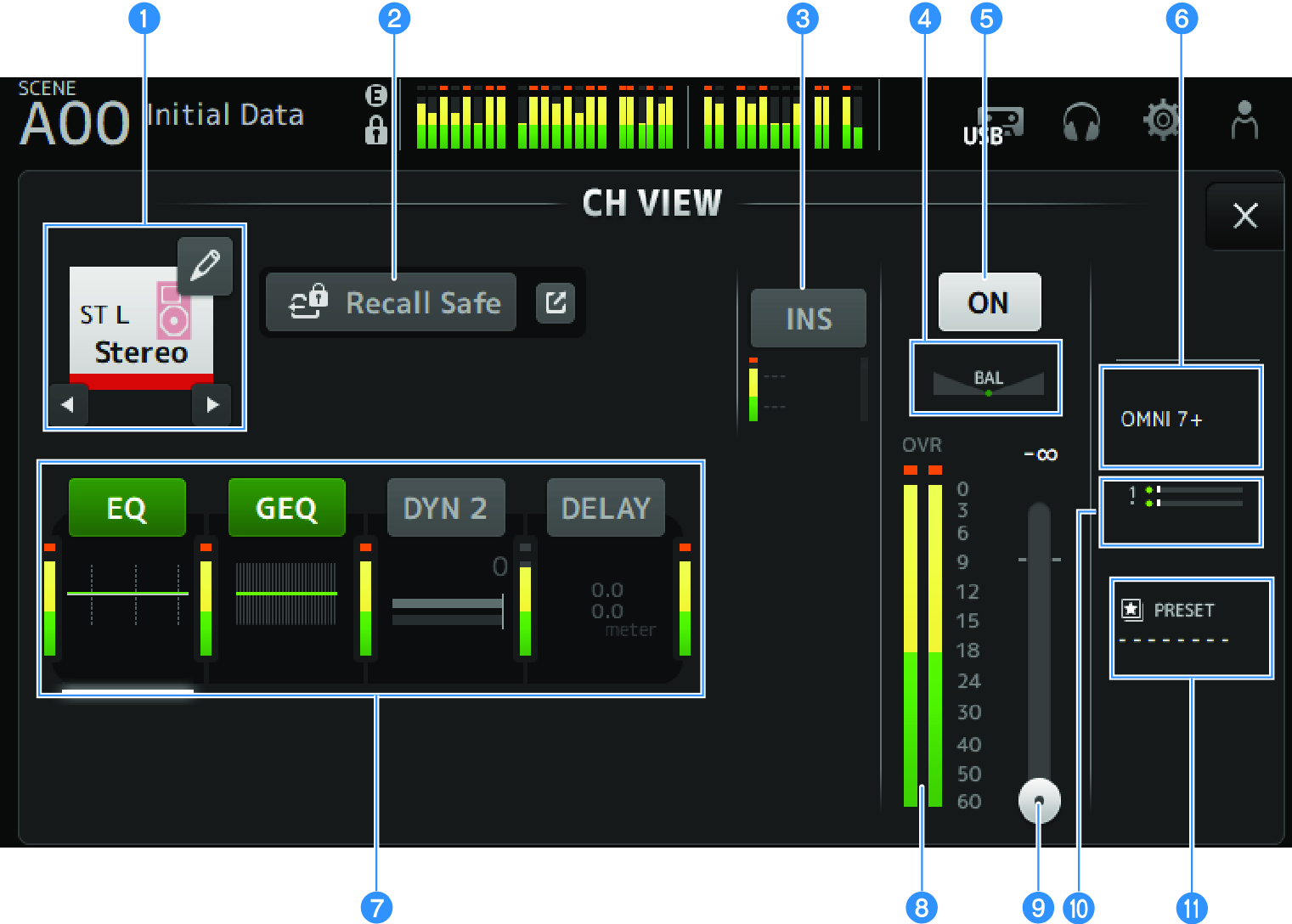 b | Recall Safe button Touch to turn recall safe ON/OFF for that channel. Touch the jump button on the right of the Recall Safe button to open the RECALL SAFE screen. |
