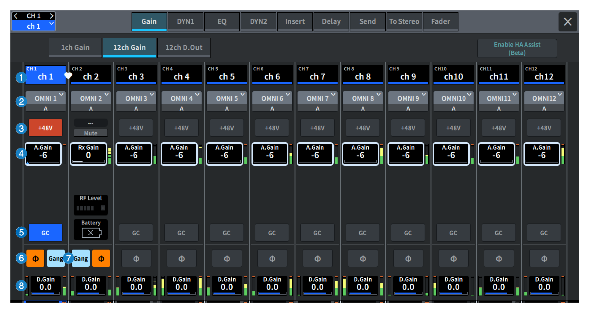 d | A. Gain This displays the HA analog gain setting value. When the screen is pressed to select, the value is adjusted by sliding vertically or horizontally or using the [TOUCH AND TURN] knob. If gain compensation is on, an indicator is displayed showing the analog gain position at the time that gain compensation was turned on. |