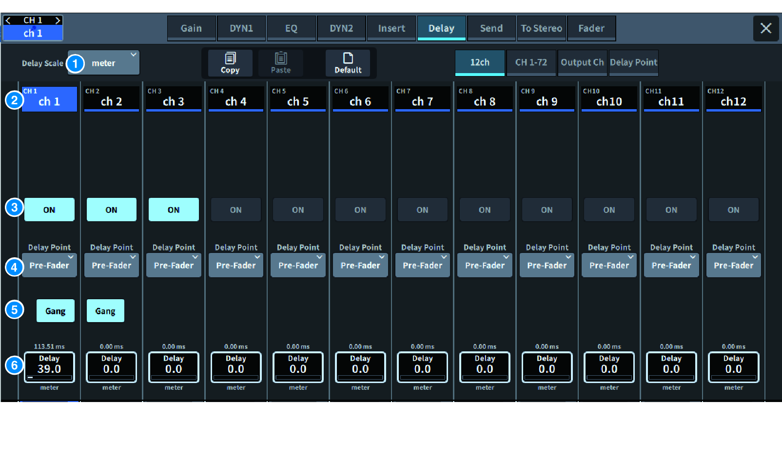 e | Кнопка Gang Эта кнопка отображается при сопряжении каналов. Если эта кнопка включена, разница между значениями задержки сохраняется и связывается. |